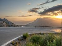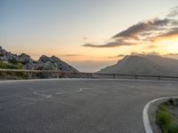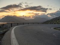 On the picturesque island of Majorca in the Balearic Islands, a stunning Armco barrier-lined road unwinds under the European sun. The asphalt glistens in the early dawn light, with clouds drifting lazily in the blue sky. As the sun breaks over the horizon, its warm rays illuminate the road in a quarter curve, creating a mesmerizing scene of sunshine and clear skies.