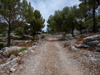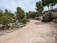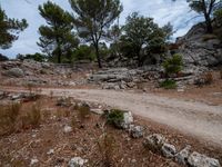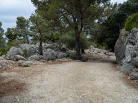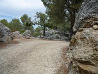 A winding road in the Balearic Islands of Spain, leading through a rocky landscape of dirt, gravel, and rock walls to a breathtaking mountain view.