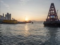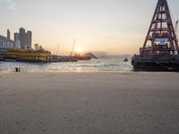The urban skyline of Hong Kong seen through the coast of Happy Valley and Wan Chai with a bridge, vehicles, cranes and boats in the foreground. The city is located in the south of the Chinese mainland, on the edge of the South China Sea.