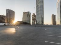 A cityscape of a metropolitan area at dawn, with concrete and asphalt roads, buildings, skyscrapers, parkings and condominiums, all illuminated by the sunshine and clear sky.