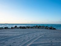 A straight road leads down to the beach, revealing a beautiful landscape of Miami Beach, Florida, USA. The coastal shore, ocean, sand, cloud and city create a stunning urban design that is unique to this day.