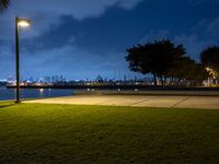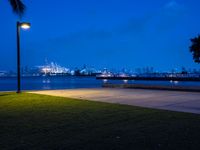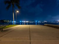 A straight concrete road on Miami Beach in Florida, USA illuminated by artificial light and street lights under a cloudy night sky.
