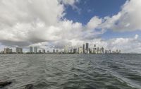 A view of Miami Beach's skyline against an open sky of clouds and the Florida coast in the distance.