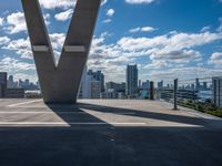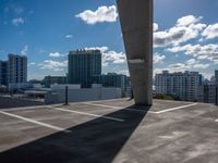 A profile of the Miami Beach skyline in Florida, USA, featuring skyscrapers, concrete surfaces, and a parking lot on a sunny day.