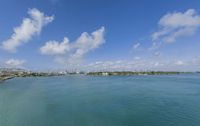 The Miami Skyline with its modern architecture, harbor and bridge over the river, seen from a coastal city in Florida, USA, against a clear blue sky and open space by the ocean.