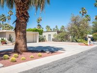 A residential villa in the Sonora Desert of Palm Springs, California, showing a modern architecture driveway entry surrounded by a parking lot of concrete, asphalt, and palm trees, on a clear day.