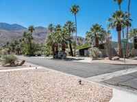 The clear sky above the Sonora Desert provides a backdrop for this mid century modern residential villa in Palm Springs, California, USA. The gravel and asphalt surface of the road creates a contrast with the nearby palm trees.