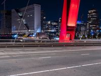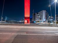A profile of a metropolitan area in the Netherlands, with a mix of modern architecture, high-rise buildings, a suspension bridge, cable-stayed bridge, street lights, and electric lights, illuminated by light streaks in the dark of midnight on a paved road in Europe.