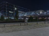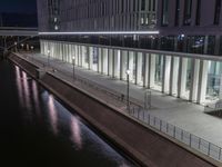 The metropolitan area of Berlin, Germany, is illuminated by artificial light and purple tints reflecting off a river at midnight. Modern architecture, high-rises, and infrastructure dominate the cityscape, featuring a mixed-use of roads, bridges, vegetation, and public spaces. Steel, glass, and composite materials complete the urban design of this coastal European city.