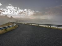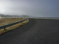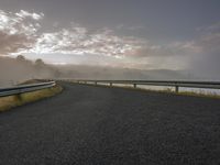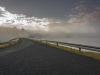 A foggy dawn breaks over a rural road, surrounded by open fields and lush vegetation.