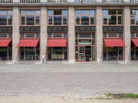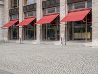 two tall buildings with red awnings in front of them and a sidewalk in front