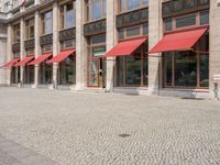 A classic architecture facade with a mix of stores, offices, houses, and other properties in the downtown area of Berlin, Germany. The street view is lined with cobble stone flooring, pink awnings, and asphalt roads, with trees and open spaces providing a shaded environment.