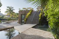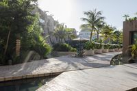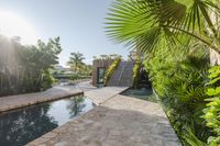 A low-rise modern architectural residential building with a swimming pool surrounded by lush vegetation in Solidaridad, Mexico.