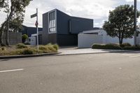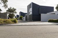 A stunning modern architectural villa in Wellington, New Zealand, with a grey sky and clouds in the background. The residential home features a sleek design, a spacious driveway, and a welcoming entryway.