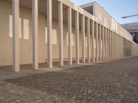 A cobble stone road winds its way through the modern architecture of Berlin, offering a clear view of the city's urban design on a bright day in Europe.