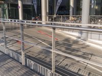 a building with steel railing and outdoor walkway with bike racks attached to the railing outside