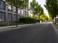A view of the modern architecture in Berlin, Germany, showing a city road with asphalt, a brick wall, and an office building in the foreground.
