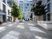 A snapshot of a busy city street in Berlin, Germany with modern architecture, mixed-use properties, residential areas, office buildings, shops, restaurants, and coffeehouses. The yellow line in the road, trees, cobble stone, and motion blur of a vehicle add to the vibrant cityscape. A perfect example of urban design in Europe.