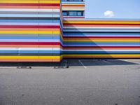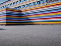 A view of the modern architecture in Berlin, Germany, with its vibrant yellow patterns and multicolored murals, against a clear blue sky.