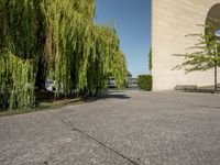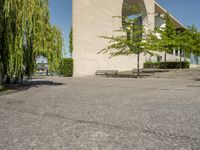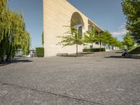 A beautiful example of modern architecture in Berlin, Germany. The building is surrounded by green grass and trees in a peaceful residential area, offering plenty of open space for residents to enjoy. The clear sky and cobblestone road surface add to the charm of this urban neighborhood. Europe, Deutschland.
