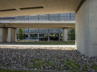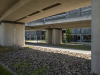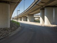 A bustling street in Berlin, Germany with mixed-use properties and modern architecture including a concrete bridge, building facades, and cobblestone roads. The clear sky reflects a variety of infrastructure elements from Brutalist architecture to tree-lined walkways.