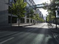 A sunny day in Berlin reveals a stunning view of modern architecture, city life, and infrastructure with an office building, house, and yellow line on the road surface, surrounded by trees and a fence in the foreground.