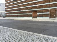 A view of the modern architecture in Berlin, Germany, with a beautifully designed building and a wide asphalt road.
