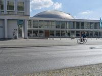 two people riding their bicycles past the building on the road, and pedestrians are outside