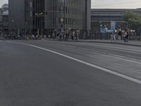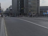 a city street filled with people and traffic next to tall buildings with a metal frame
