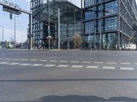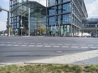 A view of the modern architecture and urban design in Berlin, Germany. The city's central station can be seen in the background, surrounded by high-rise buildings and residential areas. The picture captures the bustling street with vehicles, pedestrians, and a zebra crossing.