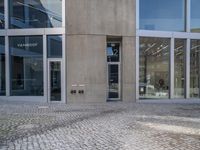 A composite material facade of a modern office building in the business district of Berlin, Germany. The cityscape is composed of grey concrete and cobble stone roads, with snow-covered trees and vegetation in the surrounding residential area. The building features a rectangular profile, with a wooden door and glass fixtures, and tints and shades of brick wall. The clear sky and urban design adds to the vibrant city life of the financial district.