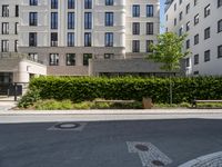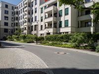 A cobble stone alley-way in Berlin, Germany, showing the modern architecture of a high-rise condominium and other residential properties with nature scattered among the urban design. The clear sky casts a hard shadow on the brickwork, asphalt road surface, and outdoor fixtures, with vegetation, trees, and shrubs adding tints and shades.