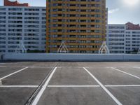 The residential area of Berlin, Germany is seen from a parking deck, with modern urban design, open spaces, and a clear sky with sunshine visible.