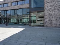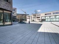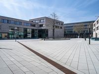 The urban landscape of Bremen, Germany is made up of modern architecture, urban design, and residential areas. Grey brick facades, rectangular windows, concrete curbs, and composite materials make up the cityscape. On a sunny day, the clear blue sky casts shadows on the asphalt road surface and plaza. Trees, doors, and open spaces provide a pleasant atmosphere.