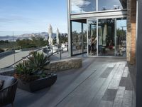 the patio has tables and chairs set out to enjoy the outdoors sun and views of the mountains