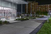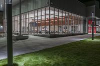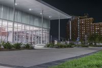 A stunning view of a modern office building with a glass facade, located in Canada's bustling metropolitan area, Toronto. The building stands tall amidst the urban landscape, illuminated by artificial lights during the night, creating a captivating sight against the clear sky.