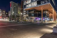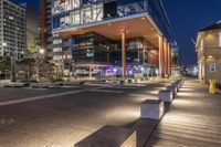 A stunning view of the city skyline at night, showcasing modern architecture and skyscrapers, reflecting on the coastal waters.