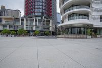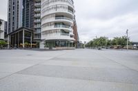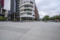 A view of a modern architectural building in a bustling city with an open space and a cloudy sky.