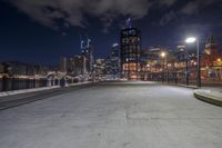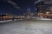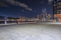 an empty parking lot with several trees near a large body of water at night with skyscrapers in the background