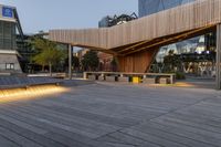 A stunning view of a modern architecture building in Wellington, New Zealand, as the sun rises. The building features a low wood roof and a walkway with a road surface and a bridge, leading to the bustling metropolitan area. The urban landscape is filled with transport options and a boardwalk, surrounded by the downtown plaza and deck. The artificial light illuminates the office buildings, showcasing the business district. Inside the building, a wood floor adds to the aesthetic appeal, creating a blend of business and art with a museum nearby.