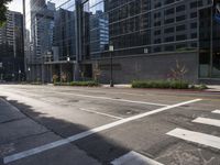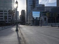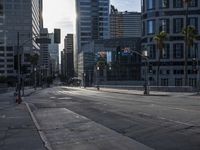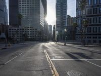 A snapshot of the modern architecture and city life in downtown Los Angeles, California, USA. The image showcases a straight road with asphalt and a line of trees, with buildings and skyscrapers forming the cityscape in the background. The bright sun casts a hard shadow on the road, highlighting the urban design and infrastructure of this metropolitan area.