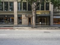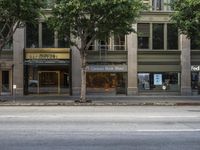 A view of the low profile modern architecture in downtown Los Angeles, California, USA, with a clear blue sky and a busy city street.