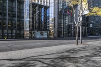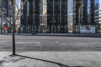 A view of a modern architecture building in downtown Toronto, Ontario, Canada. The glass facade reflects the clear sky and the straight road surface, creating a beautiful urban landscape.