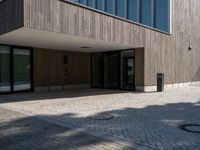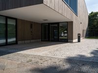 A modern urban villa in the city of Berlin, Germany, with a low profile and open space in the parking lot and driveway. The clear sky emphasizes the modern urban design in Deutschland, with similar structures in Bonn, Bremen, Dusseldorf, Frankfurt, and Hamburg.