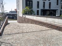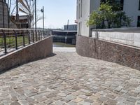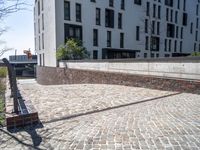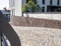 A view of modern residential architecture, brick walls, and cobblestone pathways in the city of Hamburg, Germany. Trees and vegetation provide a vibrant contrast to the urban public spaces and infrastructure. The clear sky offers a bright contrast to the composite material of the buildings, roads, and flooring.