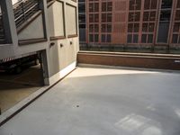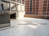 a white concrete floor in an empty room by a building with red bricks and a ramp
