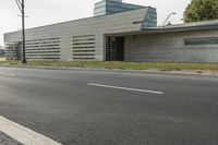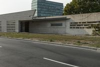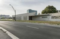 a small, concrete building stands against a wall in front of a street lamp and grass