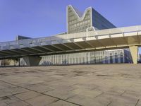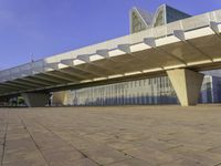 A low-angle shot of a modern architecture building in Zaragoza, Spain. The open space and lush green trees provide a refreshing view on a sunny day. The high-rise building and the line of composite material infrastructure create a striking urban design. The clear sky adds to the overall appeal of this office building in the financial district of Europe.