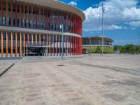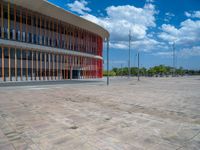 This captivating image showcases the modern architecture and vibrant city life of Zaragoza, Spain. The photo captures a stunning open space plaza with multicolored pavers and a clear sky with beautiful clouds. The urban design and contemporary architecture of this city will leave you in awe. Discover the charm and beauty of Zaragoza, a remarkable destination in Europe.