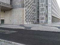 A modern high-rise building and its facade is illuminated by the sun in Lisbon, Portugal. The building is made of composite materials and has a grey profile. The asphalt surface of the thoroughfare below is lined with a public space, a museum, and a condominium. Flooring and windows complete the urban design.